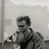 Maleren Poul Gernes står med en rose i munden ved sit gavlmaleri på Tuborg