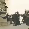 Statuen af grønlandsforskeren Knud Rasmussen udført af billedhugger Povl Søndergård er ved at blive rejst på Strandvejen ud for Hvidøre, som ses i baggrunden; polarforskerens datter, fru ingeniør Thorborg står og kikker med