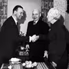 Snedkermester Jørgen Kristian Jørgensen og hustru Manda, hilser på fhv. statsminister H.C Hansen 1960, Ejby sogn