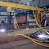 Svejsere i panellinien. Der svejses spanter med glidestyr.
