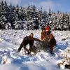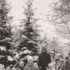 En mand viser lille juletræ frem til pige, en vinterdag.