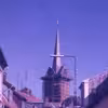 Sankt Nikolai Kirke kirketårn ses over hustage i Nakskov