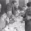 Forsamling af mænd studerer og diskuterer tegning.