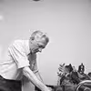 Bogtrykker A. Marcussen ved trykkerimaskine.