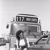 Mand stående ved gammel rutebil