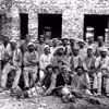 Gruppebillede af bygningsarbejdere foran bygning under opførelse.