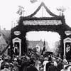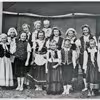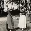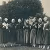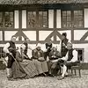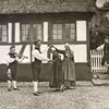 Folkedansere i folkedragter danser ved ved bindingsværkhus