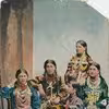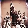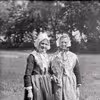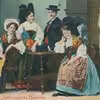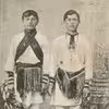 To spillemænd i folkedragter og kvinde i grønlandsk nationaldragt