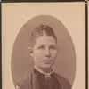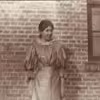 Profil af Alhed Marie Warberg iført højhalset kjole, stående ved et hushjørne, muligvis ved barndomshjemmet "Erikshaab", Hillerslev sogn.