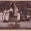 Fire Warberg-børn og en tjenestepige ved trappen på "Erikshaab" sammen med deres lærerinde, deres mor Laura Marie f. Brandstrup og dennes stedmor Johanne Christine f. Fenger.
