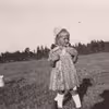 Alhed Marie (f. 1938) iført sommerkjole, hvide strømper og kyse på marken på forældrenes gård i Båxhult i Skåne.