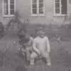 Gudrun Karen Marie Syberg f. Rasmussen sidder i haven på "Pilegaarden" sammen med børnene Karen Margherita og Henrik Syrak Syberg.