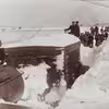 Morgenposttoget fra Odense sidder fast i sneen mellem Ladby og kølstrup eller også er det sneploven, der sidder fast mellem Mesinge og Taarup, februar 1936.