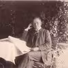 På trappen ved "Møllebakken" sidder "Tulle" fra restaurant "Pax" sammen med Else Marie f. Overgaard Nielsen. Bag dem stå Johannes Larsen.