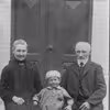Ane og Andreas Pedersen foran stuehuset til Dræby Fedvej 526 med deres barnebarn Viggo Andersen imellem sig.