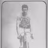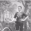 Cykelrytteren Knud Mortensen, født i Munkebo Kro, med cykel og i cykelbeklædning med medaljer.