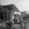 Hans Jørgen og Bertha Jørgensen ved en høstvogn i gården til Vingården.