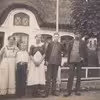 Tækkemand Hans Peder Hansen med familie foran den nordlige halvdel af huset i Nørregade