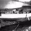 Peder Johansen og Martin Eriksen ved jolle på Lindø. I baggrunden fiskernes flåhus.