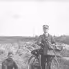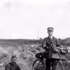 Fisker og fiskerifoged Peder Johansen, Vierø siddende på fiskegarn. Ved siden står et ukendt postbud med cykel