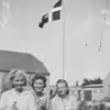 Tre piger på stengærde uden for Drigstrup skole med flaget hejst under sportsstævne.