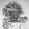 FARUMGÅRDS PARK, træer i en rund stensætning med en bygning i baggrunden
