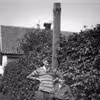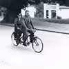 Karl Henrik Jensen siddende på cykel, med Niels Vang Larsen stående på stylter oven på ham. Karl Henrik Jensen er født i 1917.