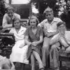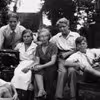 Vagn Møller, Tage Møller, Gerda Jensen, Inger Rasmussen, Karl-Henrik Jensen og en lille dreng sidder på en bænk i en have, det må være sommer, der er blade på træerne.