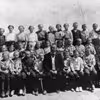 Skoleelever fra Stavnsholt Skole opstillet til fotografering udendørs. Forrest i midten ses lærer Schonnings.
