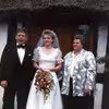 Lisbeth Littrup Jensen foran hjemmet Ellingevej 32, Refsvindinge. Flankeret af forældrene Jytte og Edvard Jensen.
