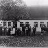Ibjerggård, Ellingevej,1906 , stråtækt murstensstuehus. Familien Poulsen står på den brostensbelagte gårdsplads.