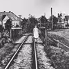Jernbanebro over Gram Å, ved Åvej 3 B, Gram. Didde Koll, datter at staionsforstander Detlef Koll står på broen.