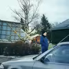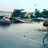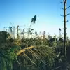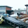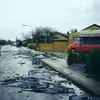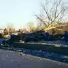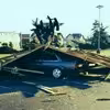 Vojens, Odinsplads. Orkanen har blæst banegårdstag ned over p-plads.