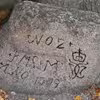 Sten med initialer. Den står i indkørslen til Ølkærgård, Fynshovedvej 535.
