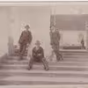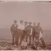 6 mænd står ved stranden (den ene bærer hvid skjorte, de 4 første fra venstre bærer hat, 2 drenge sidder foran dem.