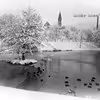 Vinterbillede fra Munke Mose. I baggrunden ses Ansgar Kirke og skorstenen ved Allerups Jernstøberi og Maskinfabrik.