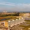 Luftfoto af Dalum, kvarteret omkring Papirfabrikken. Den ses i baggrunden med store haller og mindre bygninger.