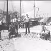 Brolægning ved Odense Havn. 6 personer på billedet, med havnen i baggrunden. 3. Person fra venstre: Rasmus Christiansen.