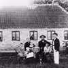 Gartner Mads Larsen m.fl., Bellinge. Familien Larsen sidder uden for deres hus "Fuglebjerglund", Bellinge Mark. Personernes navne, se bemærkninger. Billedet er affotograferet fra originalen af kunstfotograf Jørgen Jensen, JJ Foto, Odense, som be