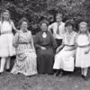 Tre generationer opstillet til fotografering i en have, bedstemor, mor og fire børn.