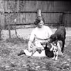 Ung kvinde sidder i haven sammen med en hund med 5 hvalpe.