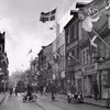 Kongensgade i festdragt. Der vajer flag fra husene gennem hele Kongensgade. I baggrunden ses en sporvogn