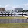 Odense Universitets barakker på Niels Bohrs Allé med H.C. Ørsteds Kollegium i baggrunden august 1972