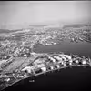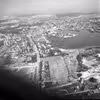 Luftfoto af Nyborg by med jernbanen og færgehavn i baggrunden. Der ses huse med badebroer ved vandet. De er beliggende på Kystvej og Holmen, den lille vej til venstre i billedet. 1968.