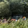 Odense Å, ca. 1900 Stereoskopbillede Parti fra Odense Å - i baggrunden anes nogle bygninger.