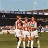 Aalborg Boldspilklub (AaB). Erik Bo Andersen jubler over mål mod Brøndby foran rekordpublikum på 20.533. År 1994