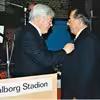 Aalborg Boldspilklub (AaB). Dansk Boldspil-Unions formand Poul Hyldgaard hædrer Anders Kristensen med DBU's sølvnål. År 1995