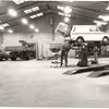 Autoværksted med bil på lift. Brugt som reklame for Domi , Dansk Oversøisk Motor Industri