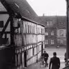 Badstuestræde østlige side fra nord. Pakhuset med bindingsværk.