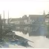 Åen set fra vest med robåd, det gamle pakhus i bindingsværk